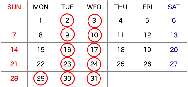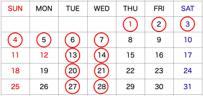 休診日について 2025.12.06 休診日について 休診日:毎週火・水 12月 赤丸は休診日 1月 赤丸は休診日 尚、休診日・時間外などに救急と思われる場合は、 「日本動物救急医療センター」にて診療を行ないます。 日本動物救急医療センター 044-411-9999(24時間対応)